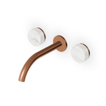 This three-hole wall-mounted mixer has an aerator, a connecting pipe, a spout that can be swivelled or locked during installation and a mousseur with individual rosettes. This specific model will add a sophisticated touch thanks to its golden Calacatta marble handles.