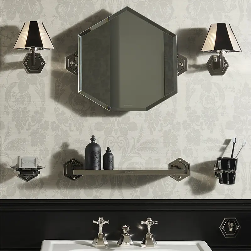 Accessoires muraux conçus pour sublimer et organiser votre salle de bains : patères chromées. Ces patères, issus de la collection Cubist de chez Czech & Speake, apportent à la fois élégance, fonctionnalité et personnalisation à chaque projet sur mesure.