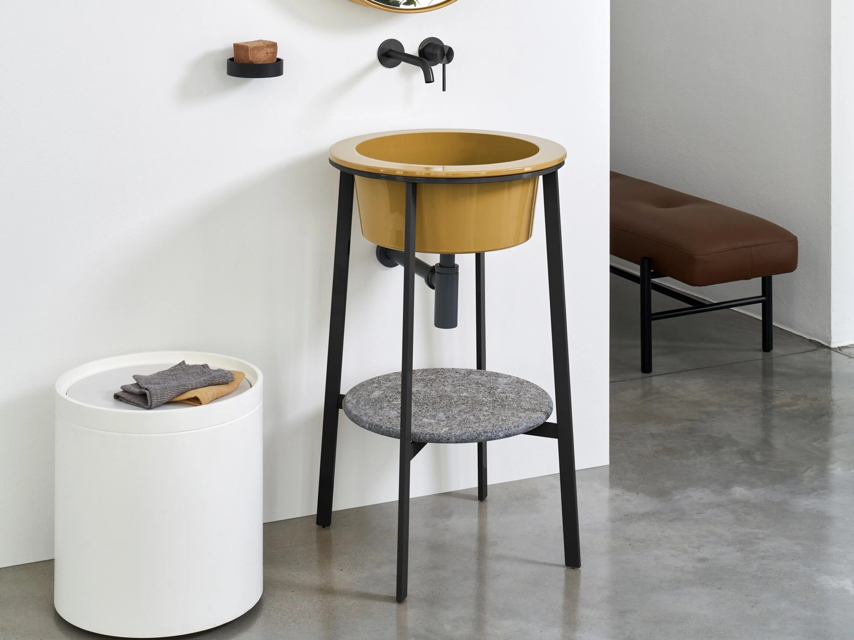 1.L’ensemble Catino Tondo de Cielo, appartenant à la collection I Catini, propose une solution harmonieuse pour les salles de bains modernes. Il se compose d’un lavabo rond (tondo) intégré à une structure sur pieds, créant un équilibre visuel entre formes douces et lignes épurées.