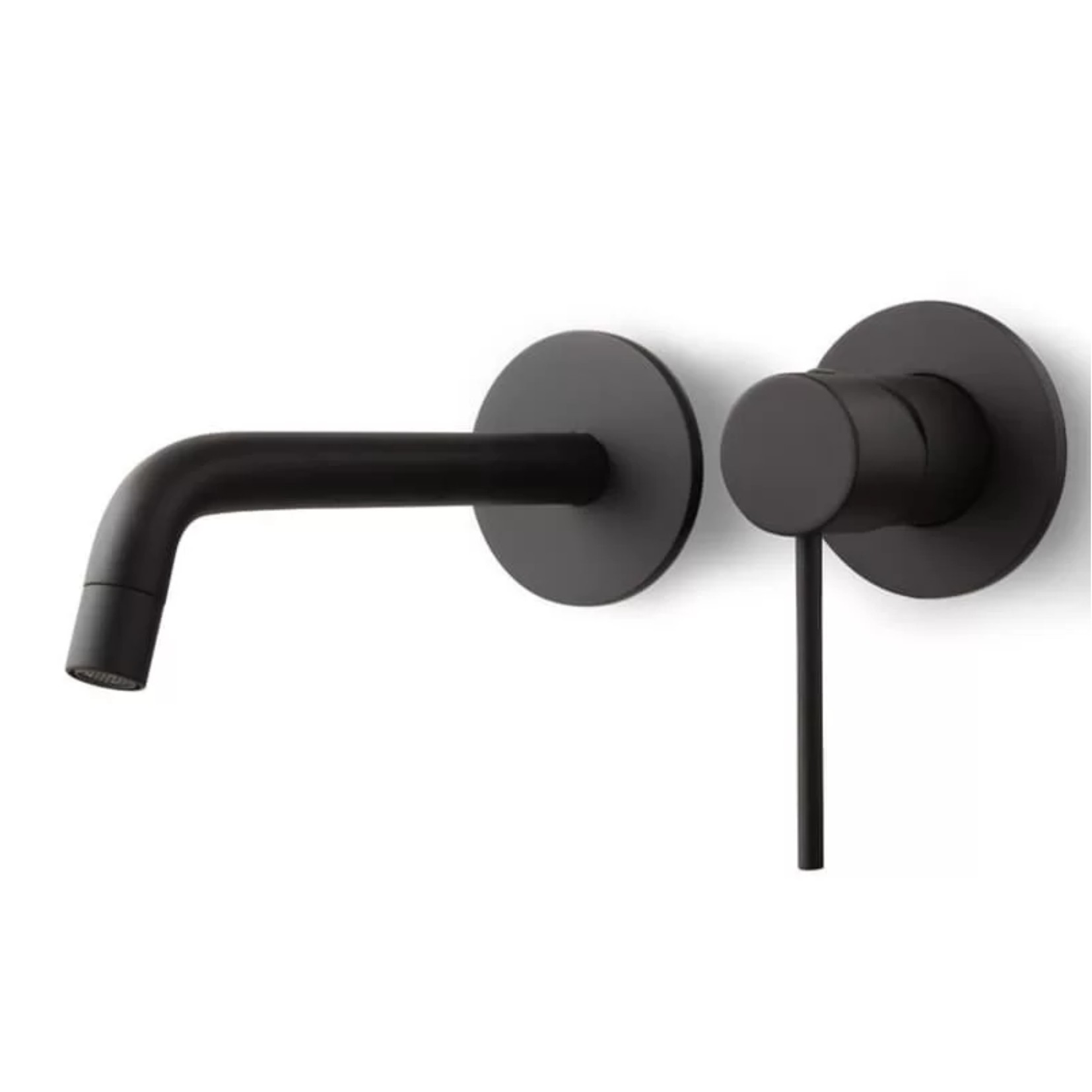 • Mitigeur lavabo mural encastré Up+ de chez Rubinetterie Treemme, design minimaliste à manette unique, finition noir mat, corps en laiton, avec corps d’encastrement inclus pour une intégration parfaite.