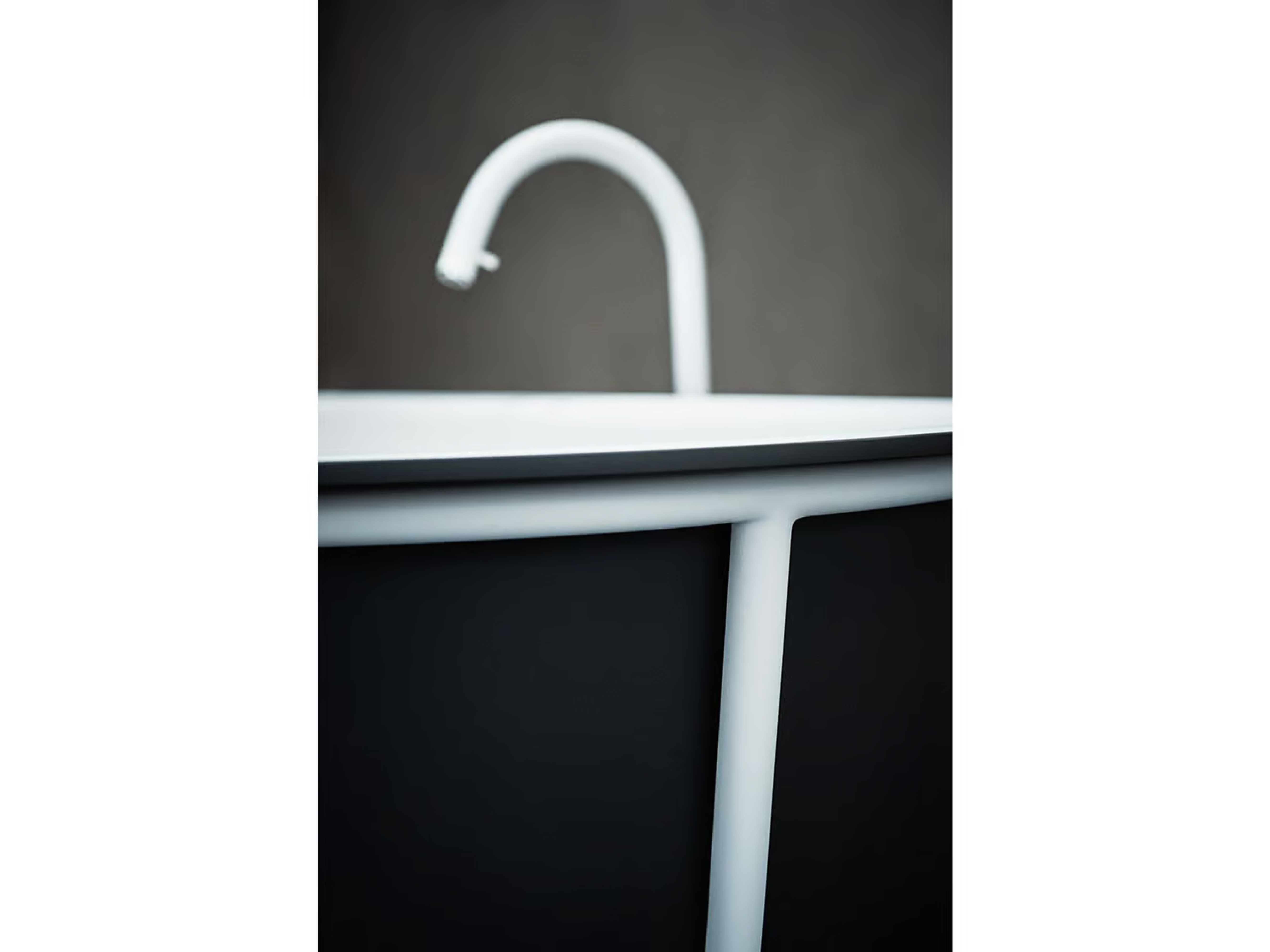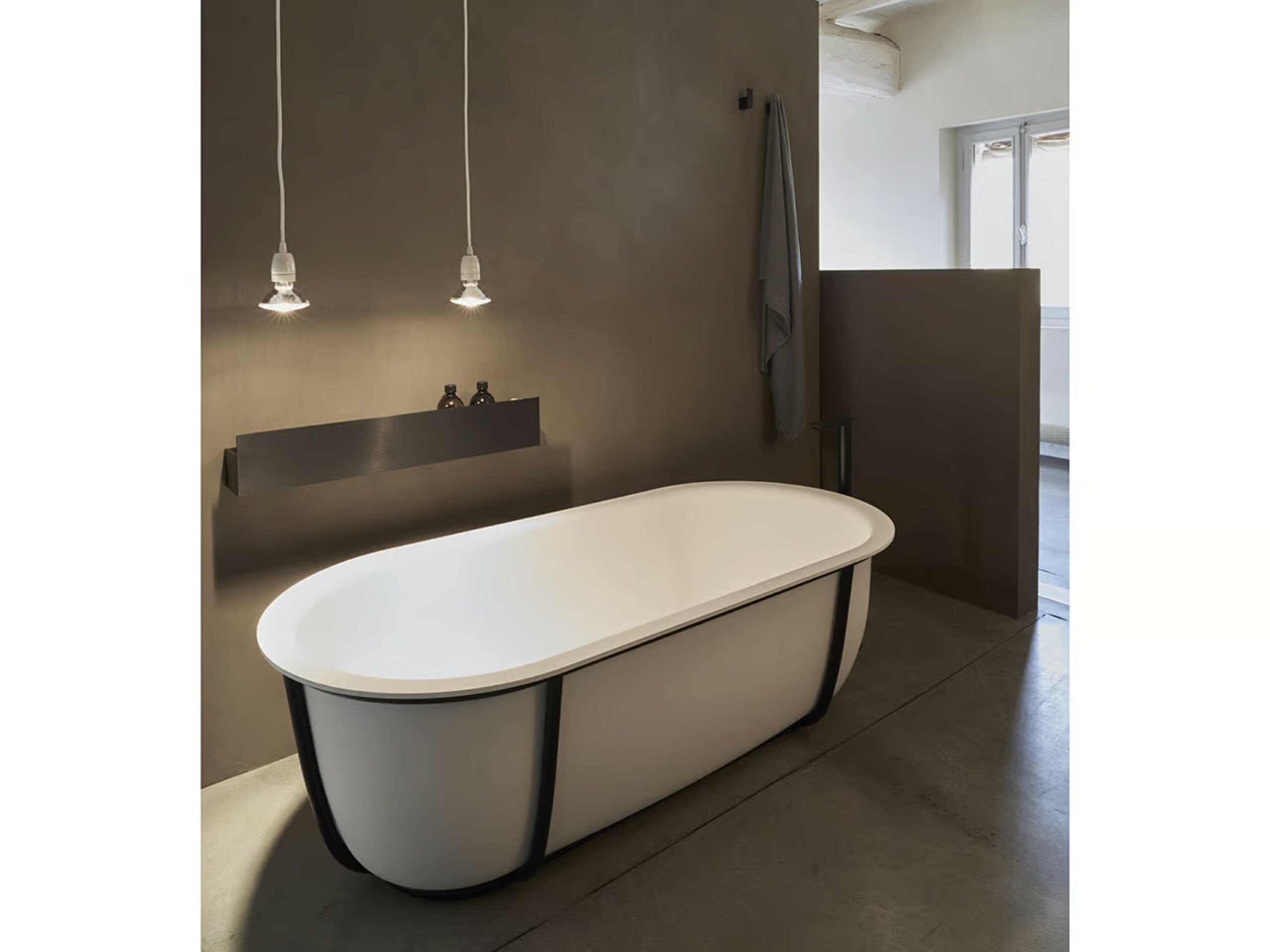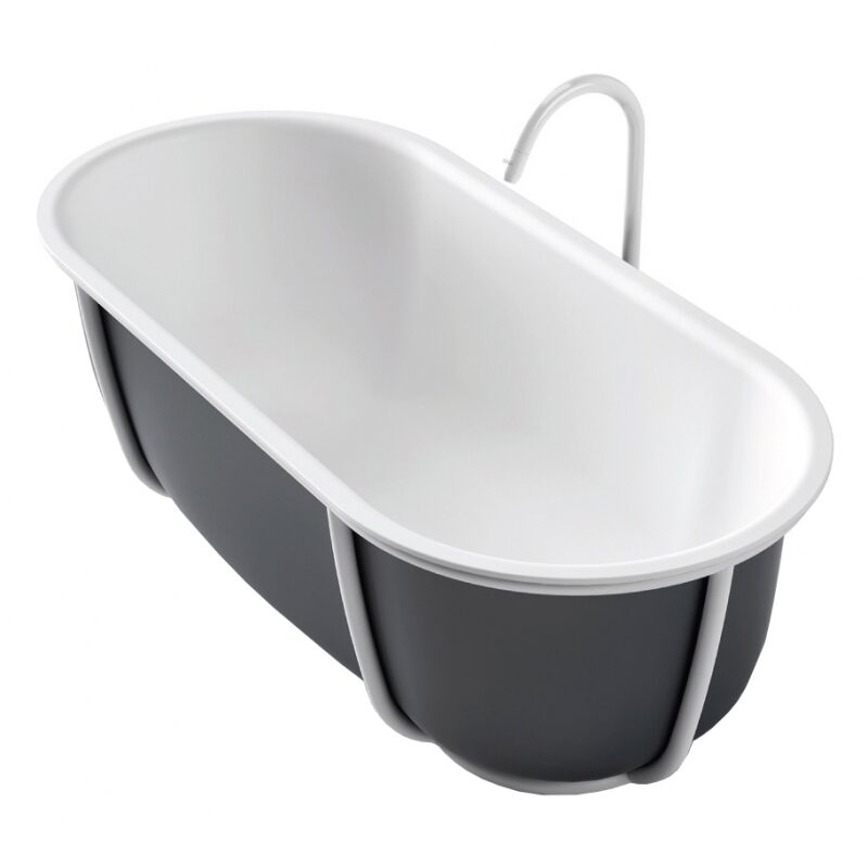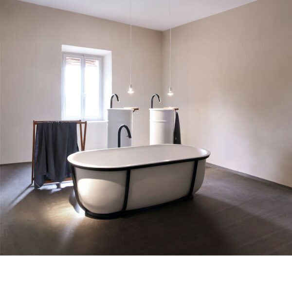 Baignoire en Solid surface blanc ou bicolore (extérieur en gris foncé RAL7021 ou gris clair RAL 7044) et structure de support en tube d’acier inoxydable laqué blanc mat (RAL9003), noir mat (RAL9005) ou gris clair mat (RAL7044) ou brossé finitions brunies. La baignoire est livrée avec vidage chromé avec système de trop-plein intégré. Sans trous pour robinetterie, les robinets peuvent être installés au mur ou au sol.